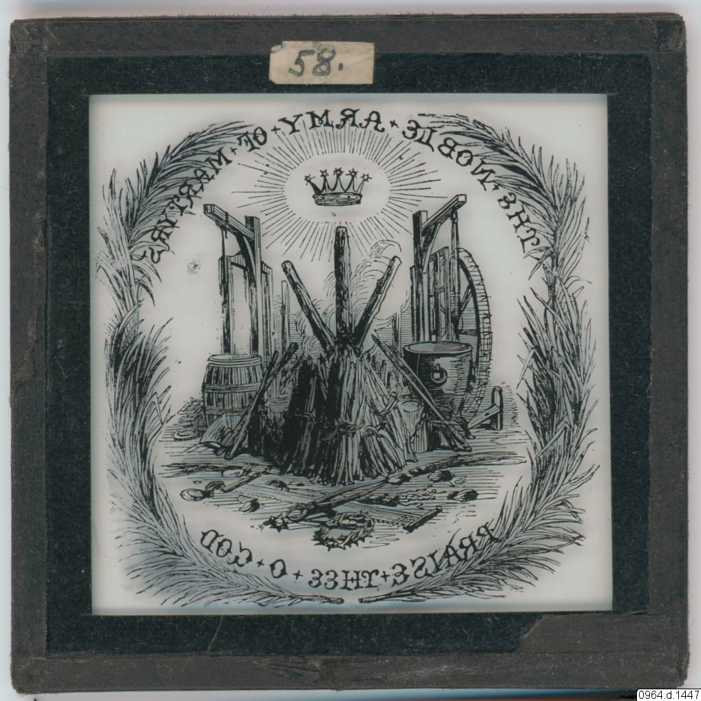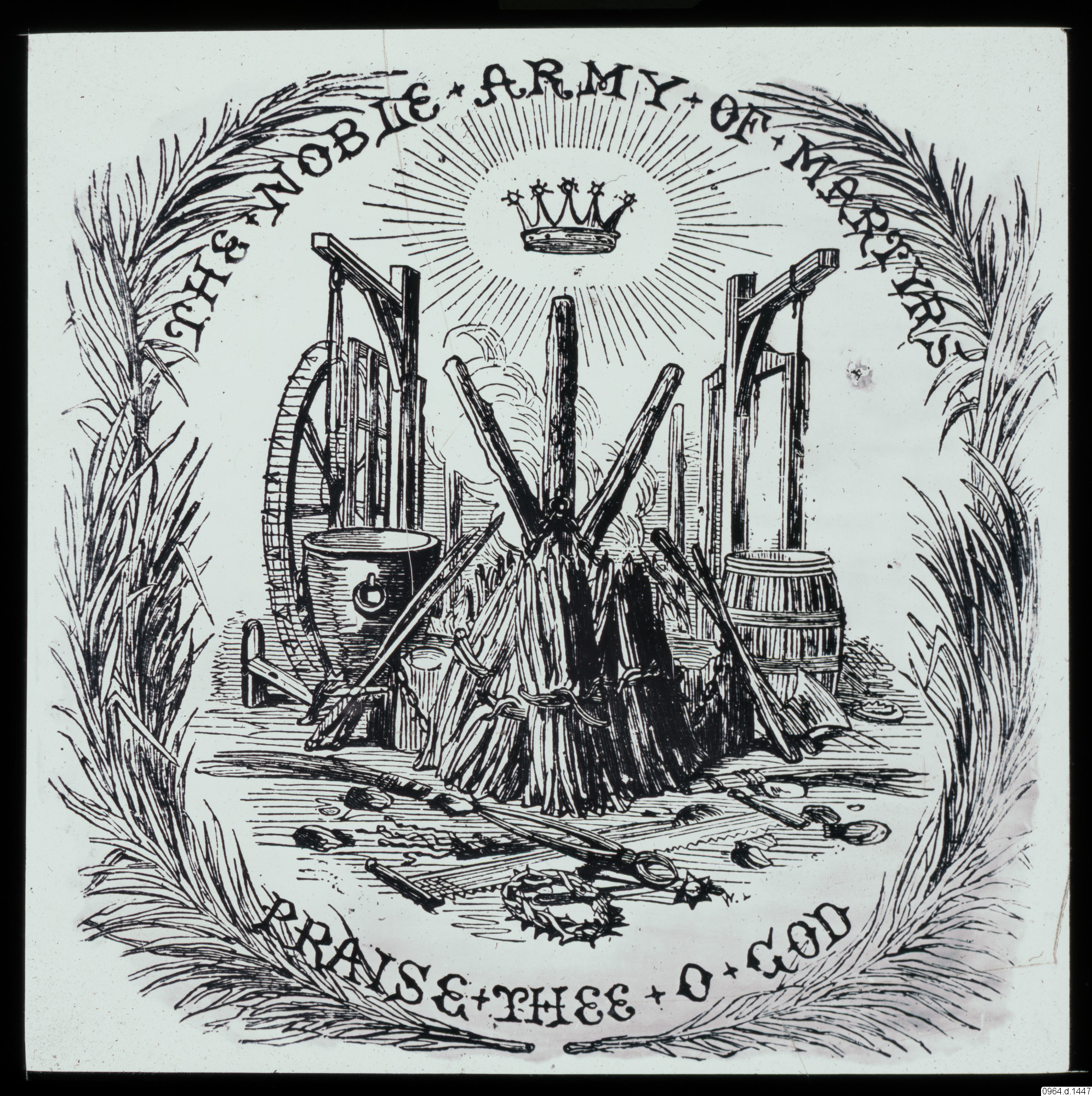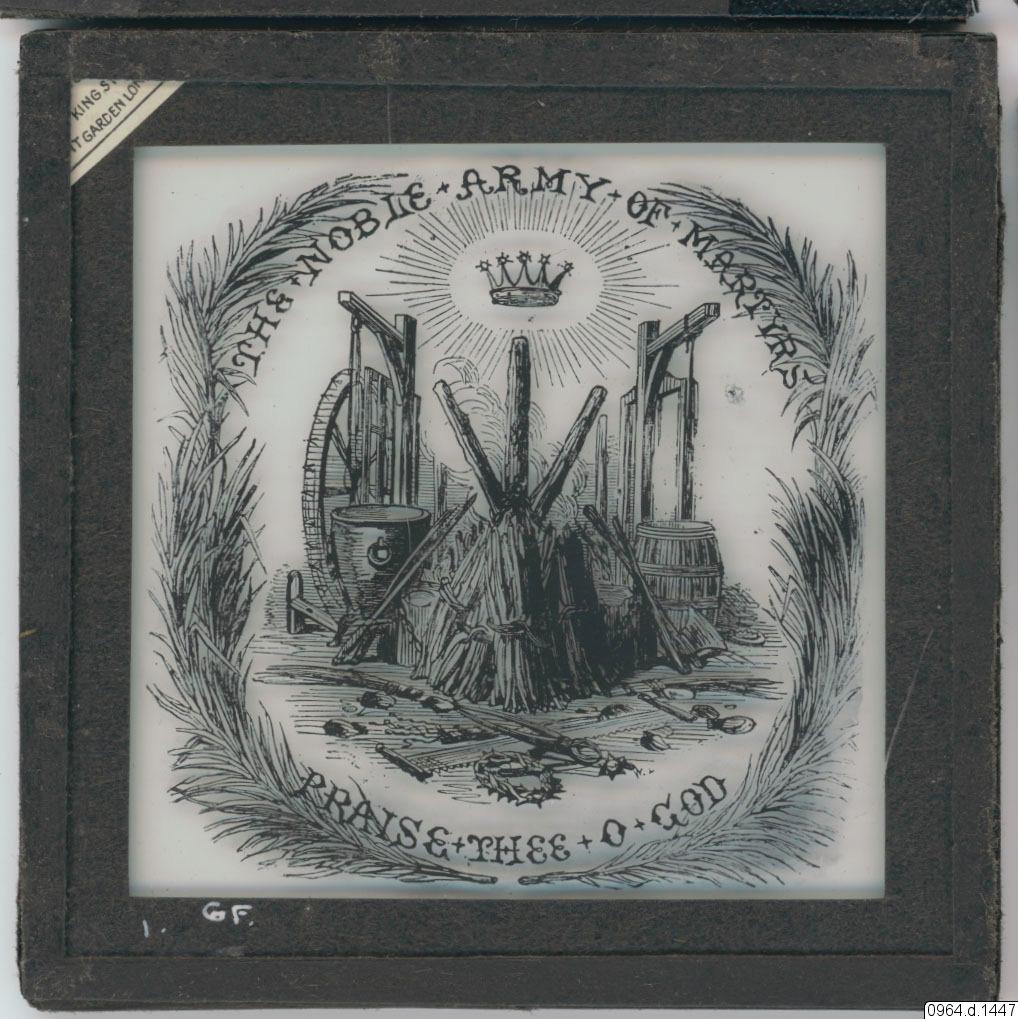 • The Noble Army of Martyrs. Praise Thee o God. Motiv av tortyrredskap, vapen, avrättningsmetoder och palmblad.