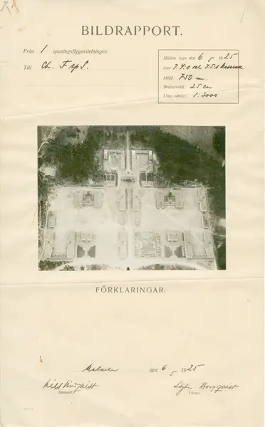• Bildrapport från flygspanarskolan på Malmen, 6/5 1925. Rapportblad om spaning med påklistrat flygfotografi.