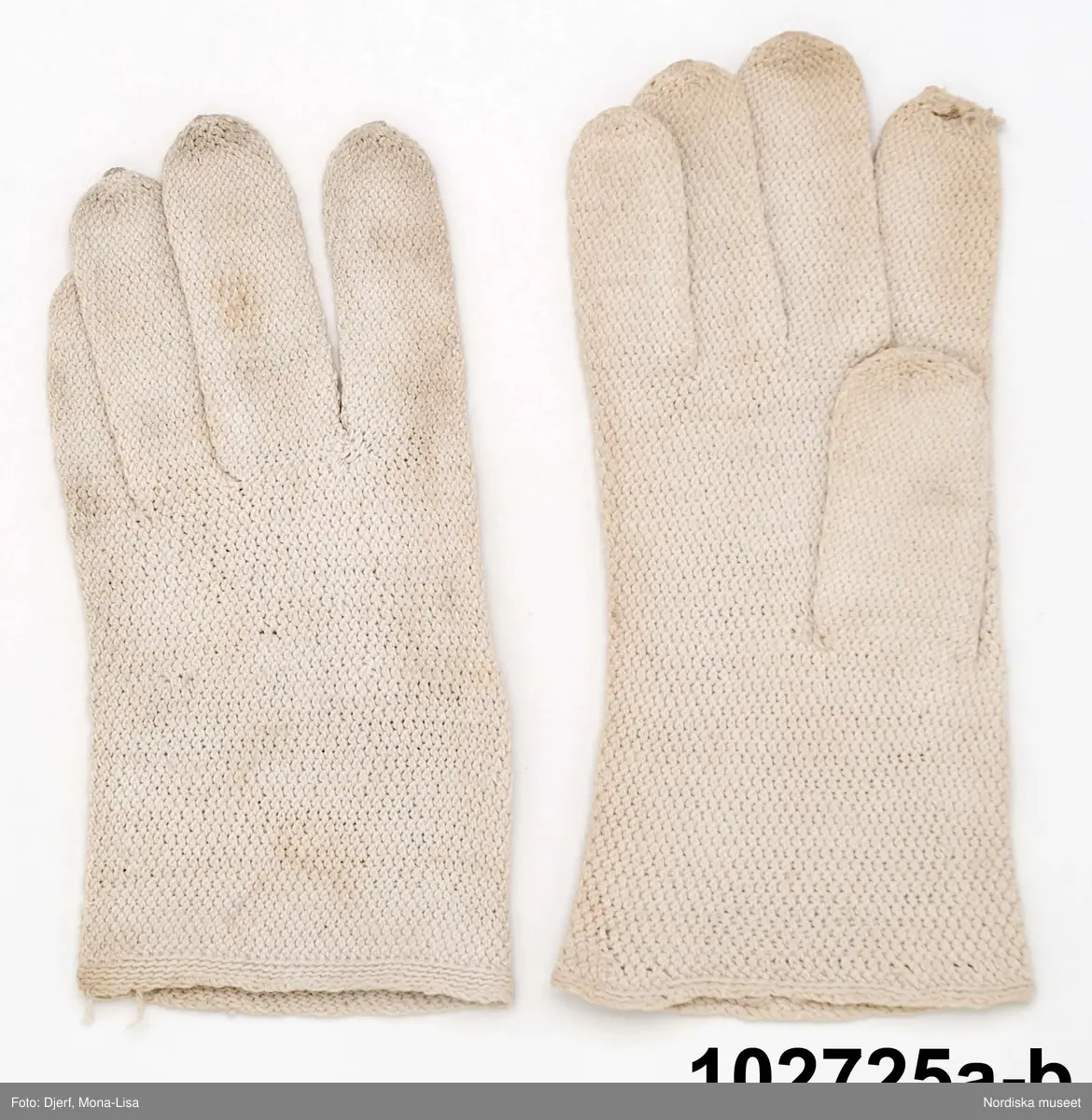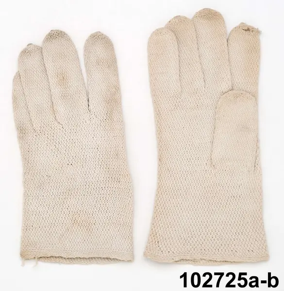 • Fingervantar av vitt bomullsgarn. Huvudliggaren uppger att de är stickade, men tekniken är snarare vad som brukar kallas påtning utfört med en liten krok på kort skaft, påtkrok. Tekniken ger denna litet knottriga ytstruktur med tvärliggande maskor på baksidan.