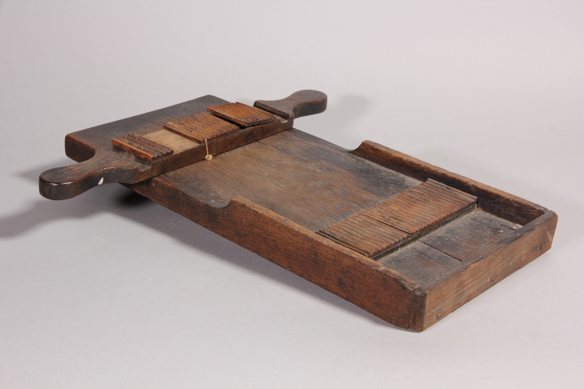 Pillermaskin av trä, rektangulär, med refflad insats av trä. Pillermaskinens ena änden går att haka fast i bordet. Lös avlång refflad del med två handtag.