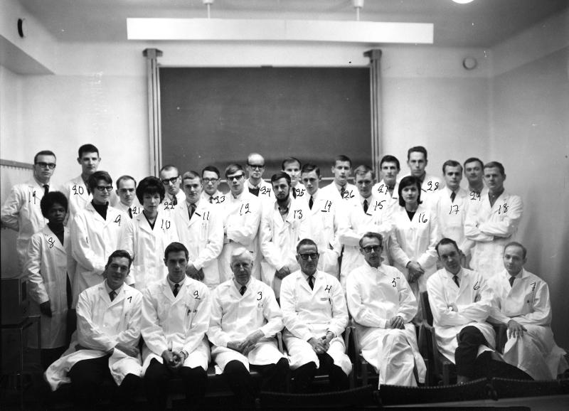 Medicinarkursen i kirurgi i Lund höstterminen 1965, med lärare. 1: Doc Carl Axel Ekman. 2: Okänd. 3. Prof. Philip Sandblom. 4. Okänd. 5: Doc. Lennart Andersson. 6: Dr. Inge Dahn. 7: Okänd. 8: Eunice Corbin. 9: Eva Terling. 10: Kersti Brager. 11: Mats Elmér. 12: Bengt Göran Petersson. 13: Ingemar Thorstensson. 14: Per Fernlund. 15: Magnus Nilsson (Hägerdal?). 16: Katarina Hohwü-Christensen. 17: In...Visa hela