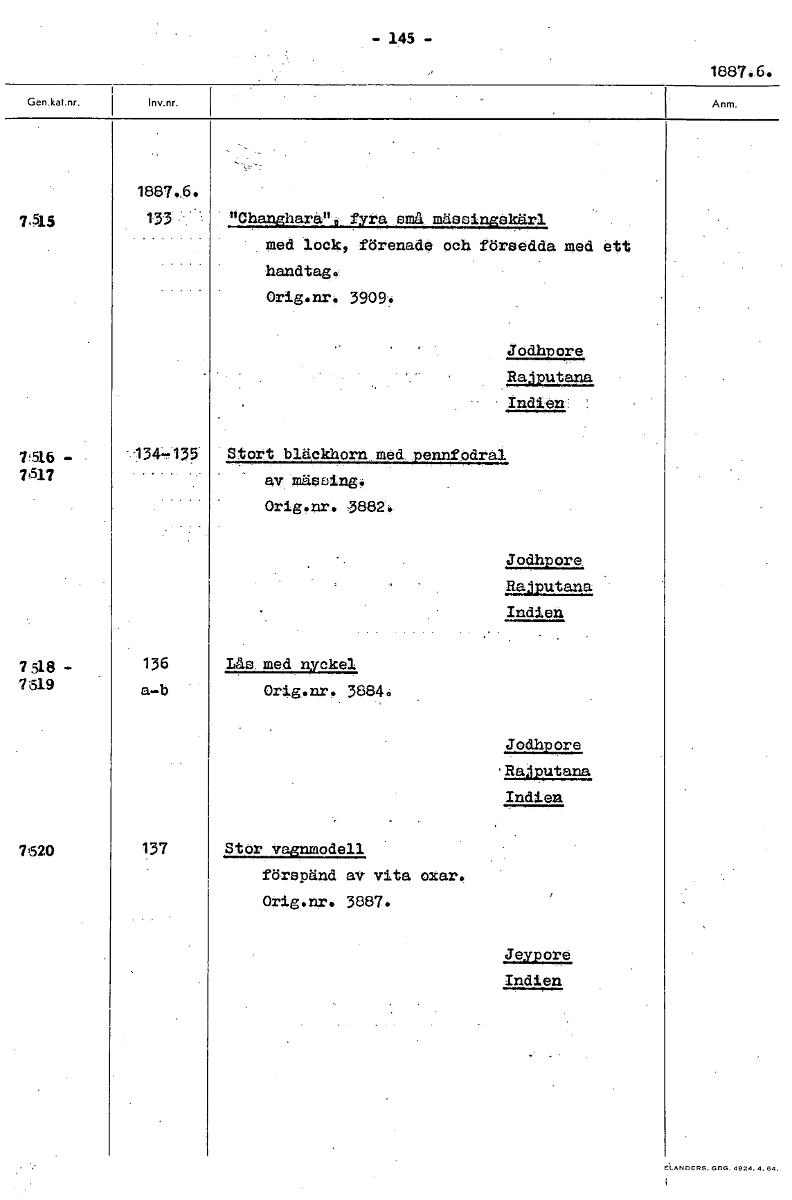 • - 145 - 188744. 1887..6. 7,515 133 "Ohangharanå fyra små mässingskärl med lock, förenade och försedda med ett handtag. Orig.nr. 39094 Jodhpore Ralputana Indi en: 7'.516 - "1344135 Stort bläckhorn med ... Visa hela