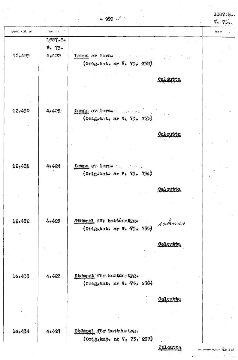 1387t;Q4, 993 14,734. - 75t 124 p422 Larma av, lerad (00k., nr V 73. 232) Calöntta 12030 44423: (Orig4k,at4 •nr 734 233) cacitttå 1243: 4#424 Lama Or, 1z5a4 (Oriedrat4 nr V 73. 234) cactitta • l24432 44425 ktg43321, rör kattega-tYri. mt4,11,c1,d (Origskat4 nr p® 734 235) ~la 1.2.433 44426 Attir.p4a för. (Orig,:kat. .nr V '734 236) 12434 44427 gr, ~ gör kattatyg,k, (Ord,g,4.1tat4, nr V4. 734 237) Calcutta [ocr]