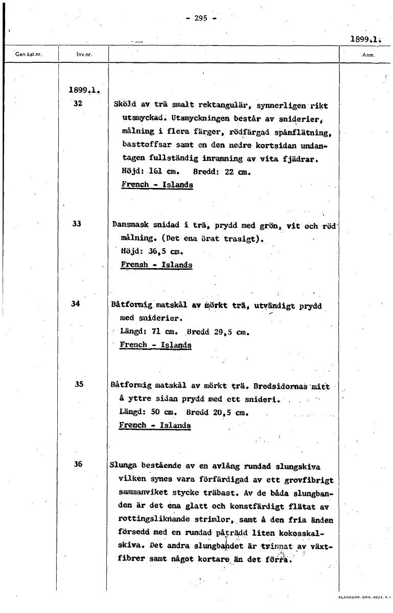 -295 — 189941: 1899.4 32 Skö3d av trä smalt rektangulär, synnerligen rikt utsmyckad. Utsmyckningen består av sniderier, målning i flera färger, rödfärgad spånflätning, basttoffsar samt en den nedre kortsidan undan- tagen fullständig inramning av vita fjadrar. Höjd: 161 cm. Bredd: 22 an. French Islands 33 Dansmask snidad i trä, prydd med grön vit och röd målning. (Det ena örat trasigt). Höjd: 36,5 cm. Frensh - Islands 34 Båtformig matskål av Mörkt trä, utvändigt prydd med sniderier. Längd: 71 cm. Bredd 29 5 cm. French - Islands 35 Båtformig matskål av mörkt trä. Bredsidornas'mitt å yttre sidan prydd med ett snideri. Längd: 50 cm. Bredd 20 5 cm. French - Islands 36 Slunga bestående av en avlång rundad slungskiva vilken synes vara förfärdigad av ett grovfibrigt sammanviket stycke träbast. Av de båda slungban- den är det ena glatt och konstfärdigt flätat av rottingslikriande strimlor, samt å den fria änden försedd med en rundad påträdd liten kokosskal- skiva. Det andra slungbandet är tvinnat av växt- fibrer samt något kortare, än det förta. [ocr]