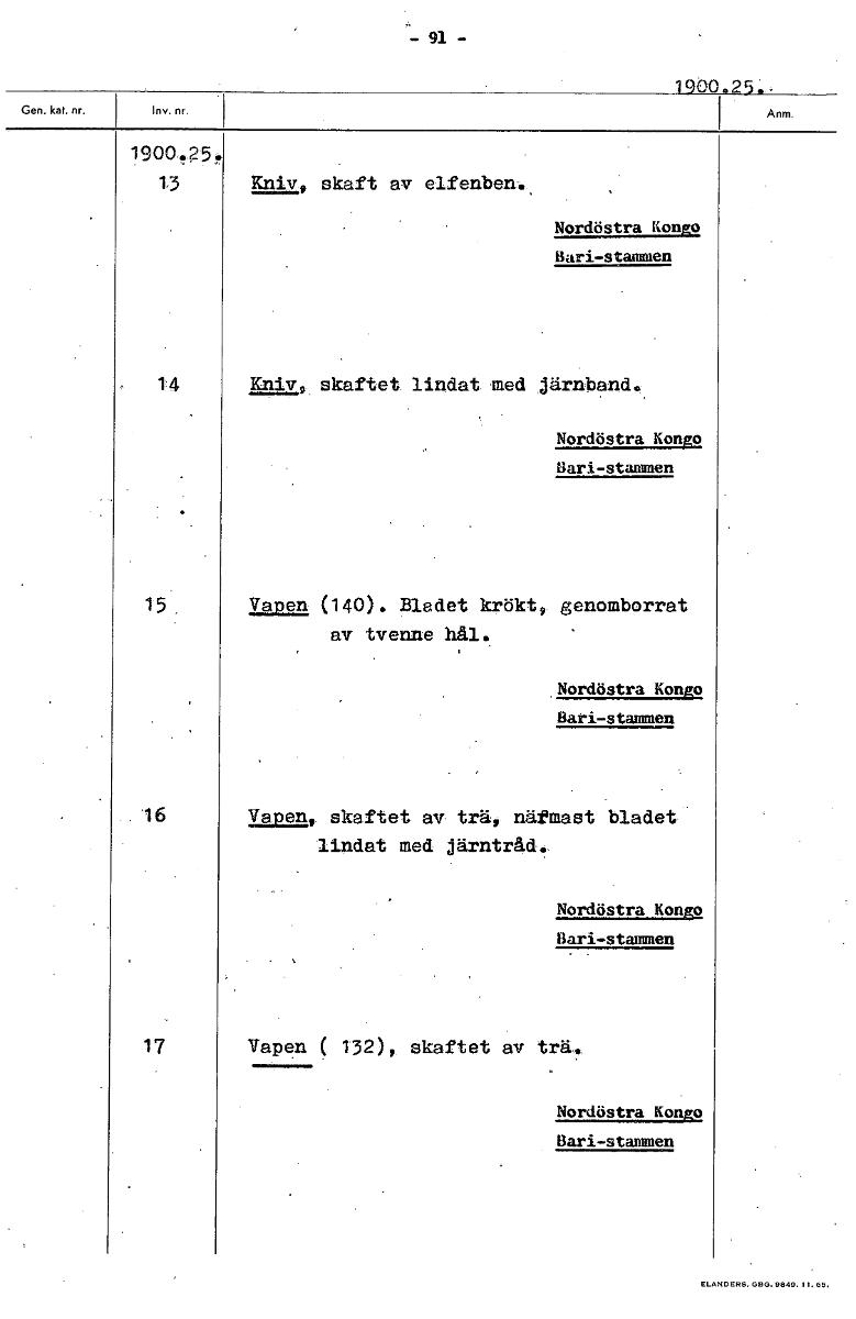 91 - 19ö0.25. 1900.25? 13 Kniv, skaft av elfenben., Nordöstra Kongo Hari-stammen 14 Kniv, • skaftet lindat med Järnband. Nordöstra Kongo Bari-stammen 15 Vapen, (140). Bladet krökt,. genomborrat av tvenne hål. Nordöstra Kongo Bari-stammen 16 Vapen, skaftet av trä, närmast bladet lindat med järntråd. Nordöstra Kongo Bari-stammen 17 Vapen ( 132),. skaftet av trä. Nordöstra Kongo Bari-stammen [ocr]