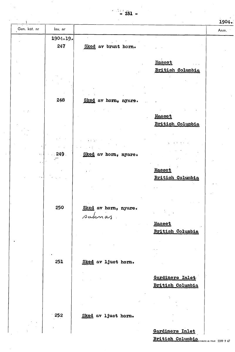 • 1904s: 1904.19. 247 Sked av brunt horn. Mat British Columbia 248 91£1 av horn nyare. Masset British. Columbia .249 8119.1 av horn nyare. Masset British Columbia 250 Sked av horn9 nyare. Masset British... Visa hela
