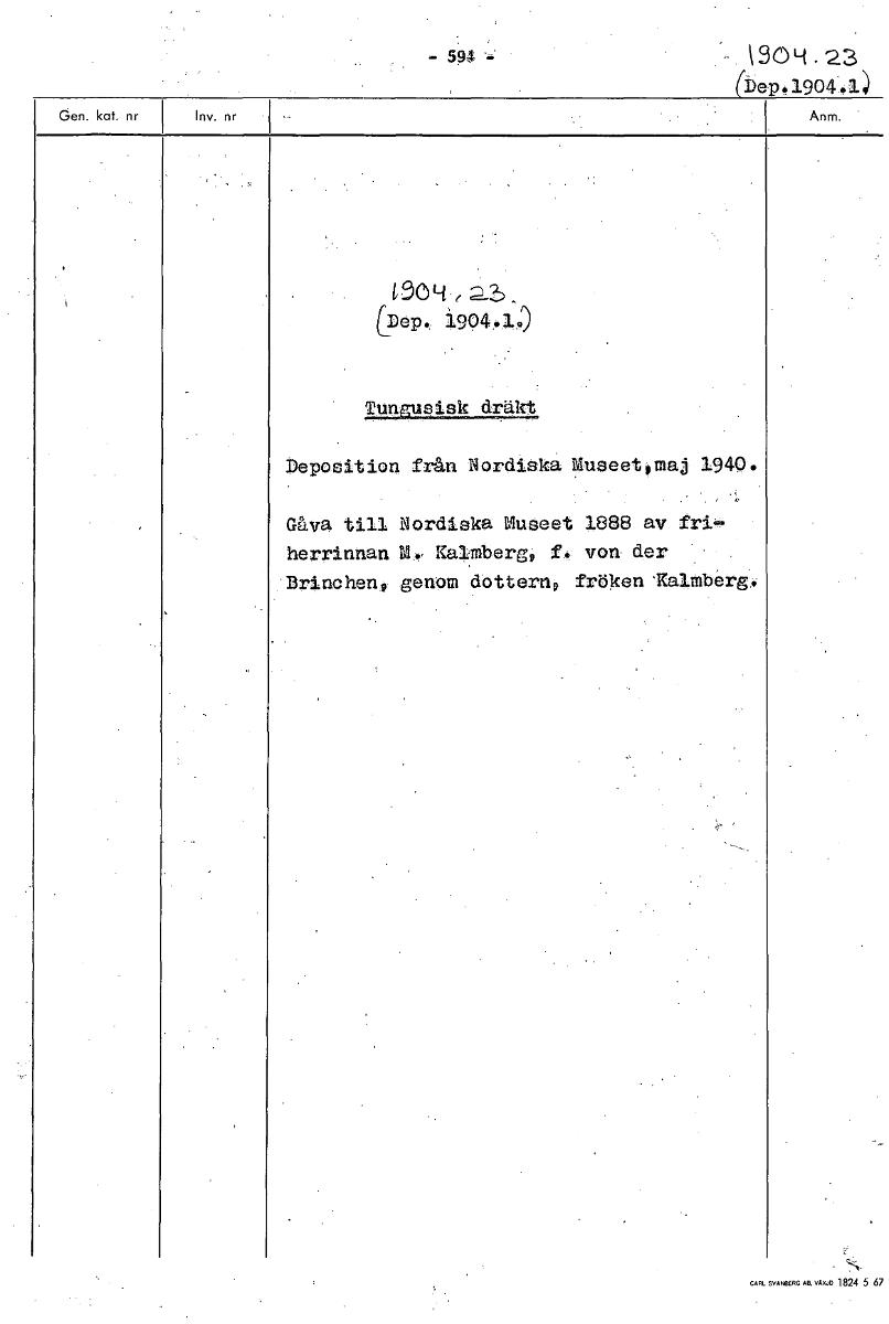 • - 594 1304.23 (Dep.19044å t904 (Dep. 1904.1.) Tungusisk dräkt Deposition från Nordiska Museet maj 1940. Gåva till Nordiska Museet 1888 av fri- herrinnan BH Kalmberg, f. von der Brinchen9 genom dottern... Visa hela