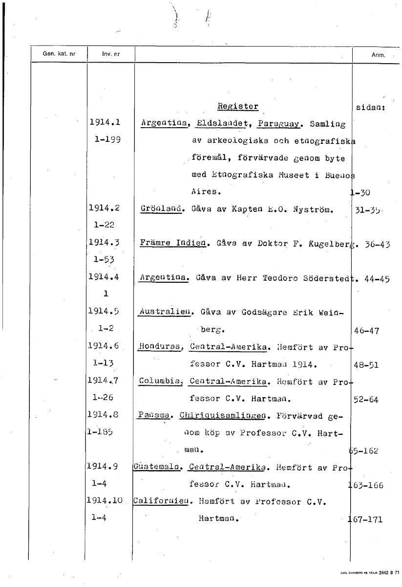 Register sidan: 1914.1 Argentina, Eldslandet, Paraguay. Samling 1-199 av arkeologiska och etnografisk föremål, förvärvade genom byte med Etnografiska Museet i Eueno Aires. -30 1914.2 Grönland. Gåva av...