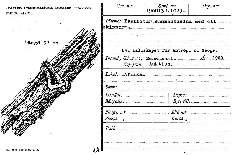 • Gen. n:r STATENS ETNOGRAFISKA MUSEUM, Stockholm ETNOGR. ARKEOL. 1900132.1023. .Samla n:r Dep. n:r Fömmi : Barkbitar sammanbundna med ett skinnrem. Längd 32 em. Sv. Sällskapet för Antrop. o. Geogr. Ins... Visa hela