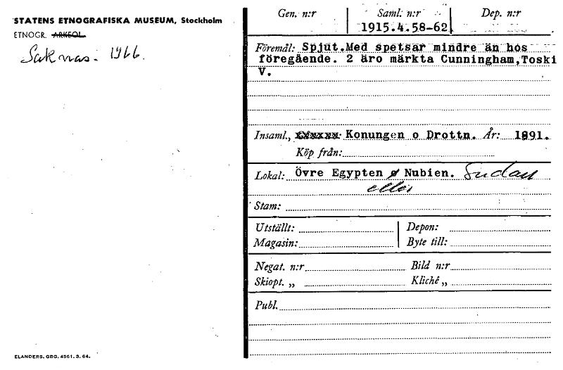 • 'STATENS ETNOGRAFISKA NIUSEUNI, Stockholm . ETNOGR. Itrik4K421... k ELANDERS. GBG. 4561.3.64. Gen. n:r 1 ' Saml. n:r• Dep. n:r I -1915.4.58-62 _ . _ ,_i Förenål: Spjut.lied spetsar mindre 'än' hos- -... Visa hela
