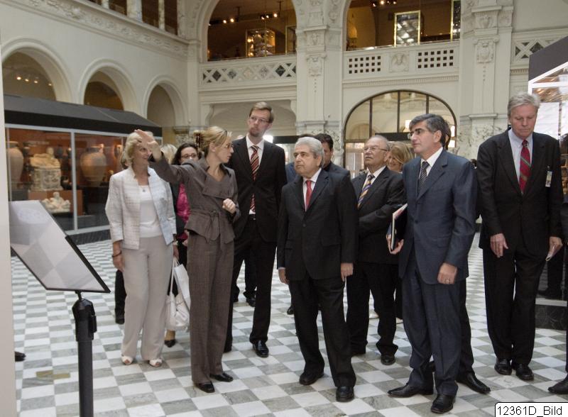Medelhavsmuseet, Cyperns president Dimitris Christofias besöker museet. Sanne Houby-Nielsen visar mångkulturmontern.