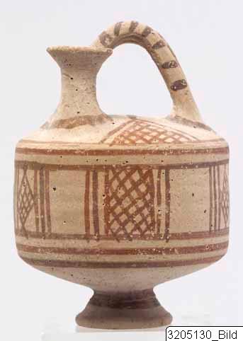 Short cylindrical body, low, flaring foot, vertical spout with flaring rim and ridged basket-handle on shoulder. Decoration in purple, matt paint. Horizontal bands at carination of upper and lower body, on foot, on neck of spout and handle-root. Transverse strokes on handle. In the body-zone, metope decoration of framed, latticed rectangles and lozenges.