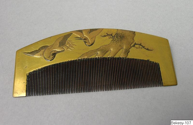 Kam för kvinna med dekor av tranor och tallar. Sannolikt 1800-tal. Guldlack på trä (maki-e). Hårprydnader för kvinnor som kammar, hårpinnar (kogai) och andra hårsmycken som exempelvis hårnålar (kanzashi) var gjorda i lackerat trä, sköldpaddsskal och metall, ofta med olika inläghgningar och dekor som guldlack. Kvinnofrisyrens förändring gick från tekniskt enklare till mer avancerade frisyrer uppb...