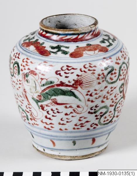 Kruka av porslin med dekor i gröna och järnröda emaljfäger och underglasyrsblått. Dekoren föreställer dekorativa band, växtlighet och bl.a. två hundar (?) med bakomliggande moln. Krukan har en låg kant och är lätt äggformig, med en bukning upptill. Oglaserad fot / sokel. Mynnign med kort hals. Sen ming, 1600-tal. Kina. Höjd 45 cm.
