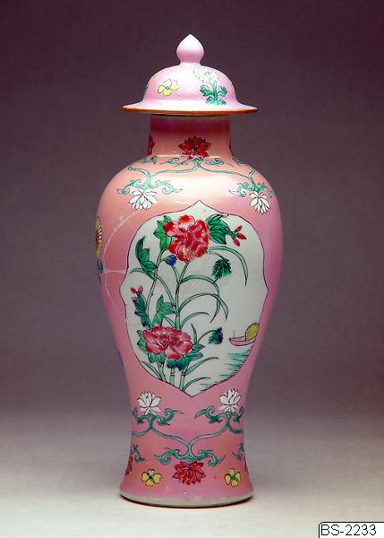 • Uppsatsgarnityr, 5 delar bestående av två vaser och tre urnor, porslin, famille rose, blomsterdekor.