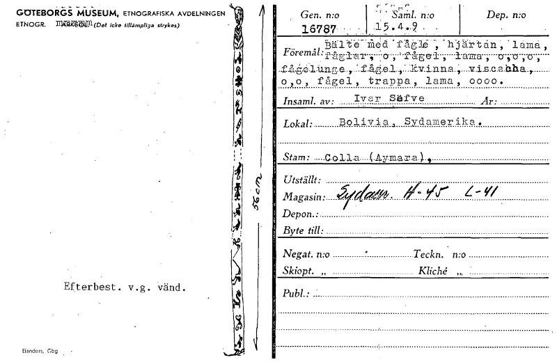 _ GCITEBORGS MUSEUM, ETNOGRAFISKA AVDELNINGEN E TNOGR. nitråk-USLITI (Det icke tillämpliga strykas) Efterbest. v.g. Vänd. Eianders, Gbg • . Gen. n:o 16787- .-• • _ . . . .. .._, . ' Sil. n:o .3-.5 • 4-9 - .. _. .. Dep. n:o tä-1. te -.).1i dl ' fåglä—, ' hjärt ån ; « lama. , Föremål:m.31.a.i, ,. ., o, • i'å ge-i, I-a-nia , o ;IT , 'a , o,o , fågel, trappa, lama, 0000. Insaml. av: Ivar Säfv e År • Lokal: Bolivia ., Sydamerika. Stam: C oll a (A:Jr:lax-a ) 9 Utstå/it: Magasin: bli-1'6K / Depon. • Byte till: Negat. n:o ' Teckn. n:o Skiopt. „ Kliché Publ • [ocr]