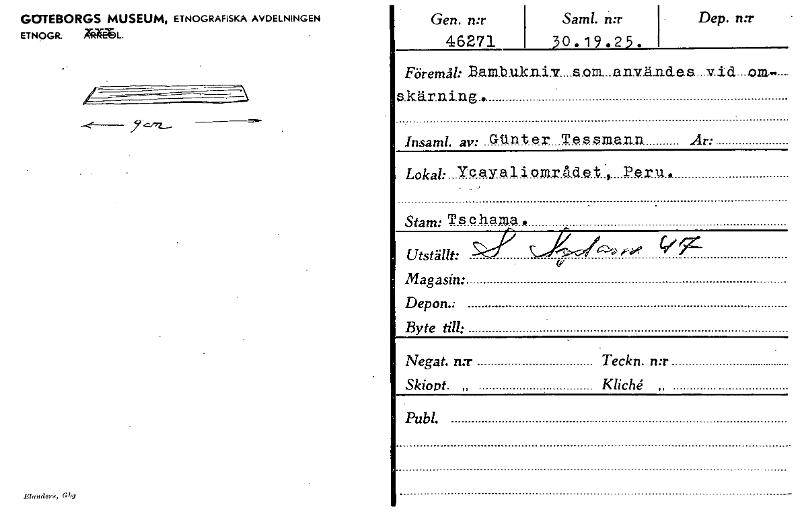 • GOTEBORGS MUSEUM, ETNOGRAFISKA AVDELNINGEN ETNOGR. ZR-11:40L. y Gen. n:r 46271 Saml. n:r 30.19.25. Dep. n:r Föremål: Bemb.ulcn.i.v....s.om....använde.s. v.id_...om--- skärning.. Insaml. av: Gtinter T... Visa hela