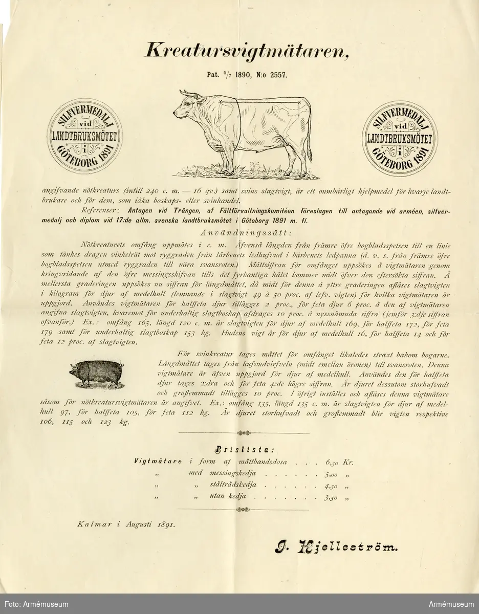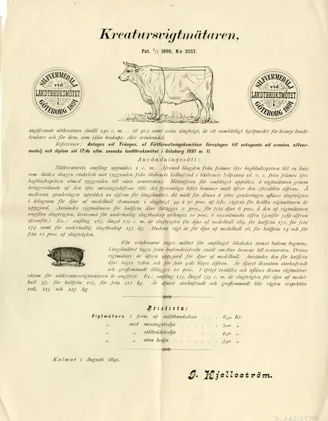 Dokument med instruktion till Kreaturs-vigtmätaren (Pat 5/7 1890, N:o 2557), Kalmar 1891.