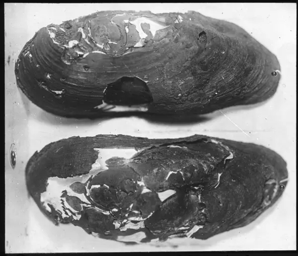 'Bildtext: ''Flodpärlmussla med läkt skal.'' 2 st musselskal. :: :: Ingår i serie med fotonr. 5119:1-8. :: Flodpälrmusslor med ''pärltecken'', läkt skal.'