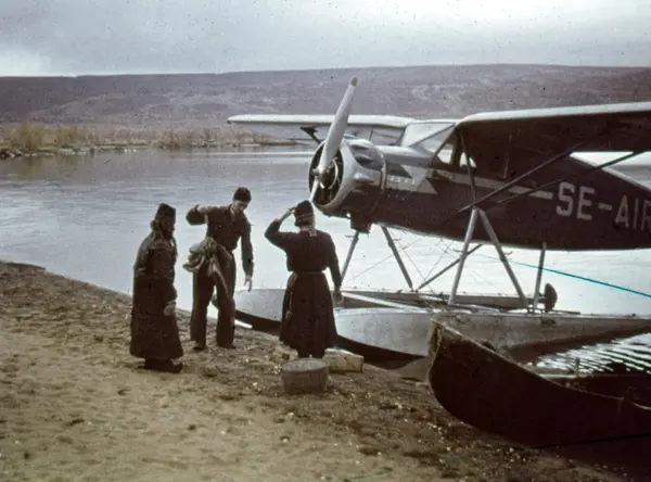 Påskrift på monteringen: "Fiskflygare vid Sitojaure." Två samer och pilot vid sjöflygplan som landat vid stranden intill en uppdragen båt.