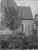 Fönsterna är rundbågiga försedda med järnsmideskarm och blyspröjsade glas.
