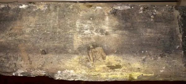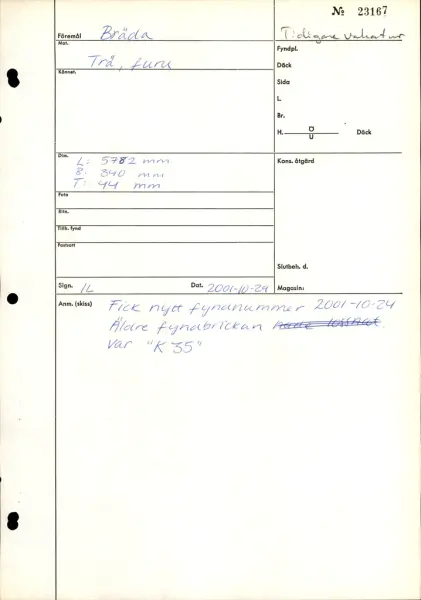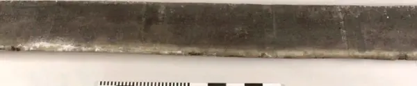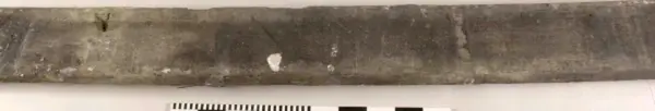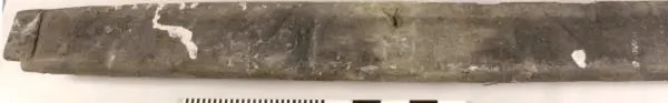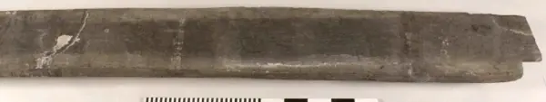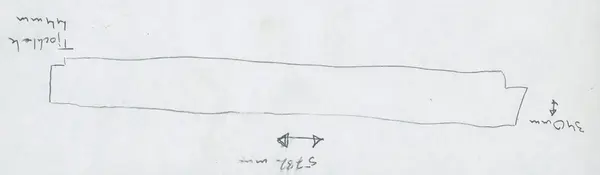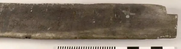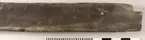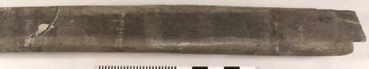 Urtag i bägge ändarna. Avsmalnande i ena änden. Skador längs med ena långsidan. Urgröpning på ena sidan.