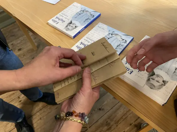• Åke Augustsson, son till Edits storebror Karl Edvard, övertog sin fasters dagböcker när hans far Karl Edvard dog. På boksläppet hade Åke med sig Edits dagböcker. På fotografiet håller Greta Åberg i en av dagböckerna.