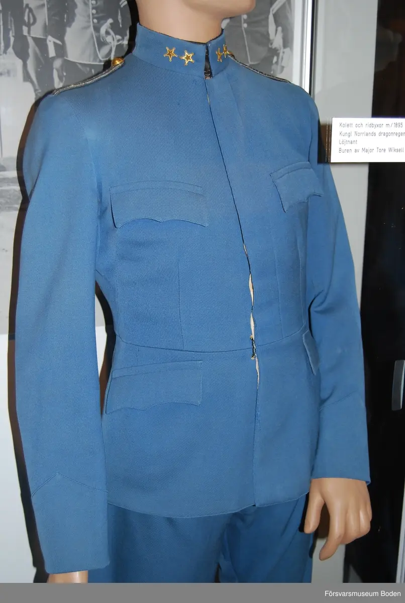 Mellanblå med krage i samma färg försedd med två stjärnor betecknande löjtnant. Framtill dold knäppning med 7 knappar i enkel rad. Axeltränsar m/1871 av dubbla silverfärgade fyrkantsgaloner med knappar av regementets modell.