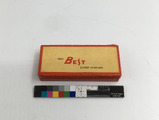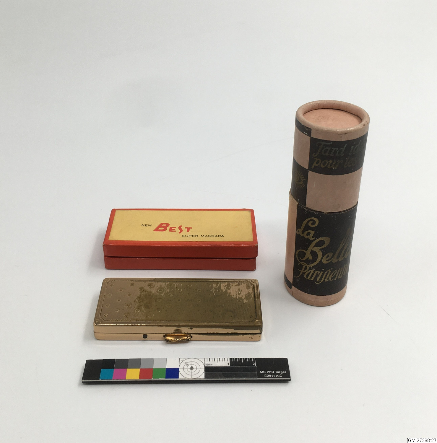 2 st fodral för mascara samt en burk för ögonbrynsfärg. :a är en pappersask innehållande mascara i kaka samt pensel, :b är ett tomt metalletui med spegel i locket med plats för macsara och pensel och :c är en rund pappersburk med en tub med ögonbrynsfärg med tillbehör.