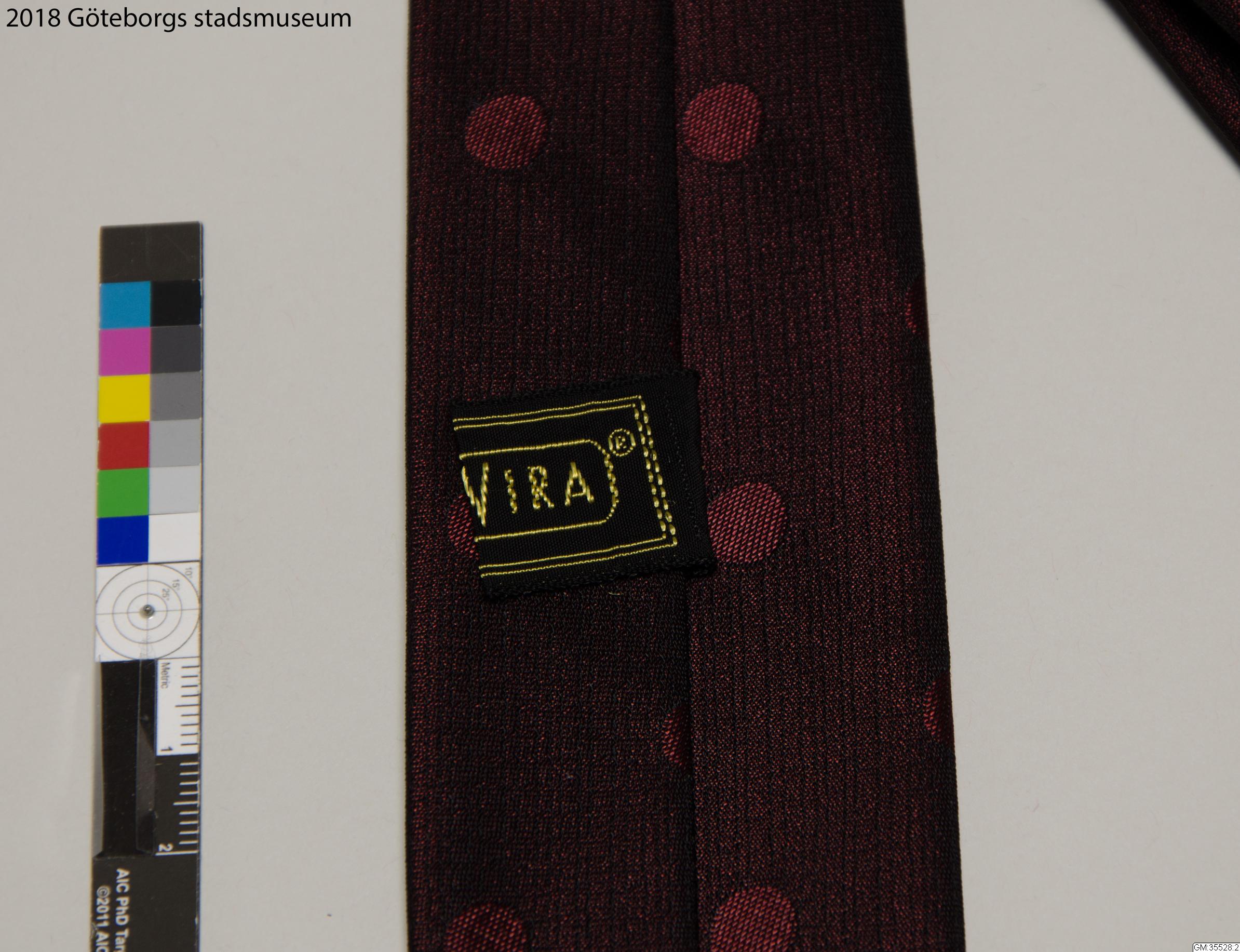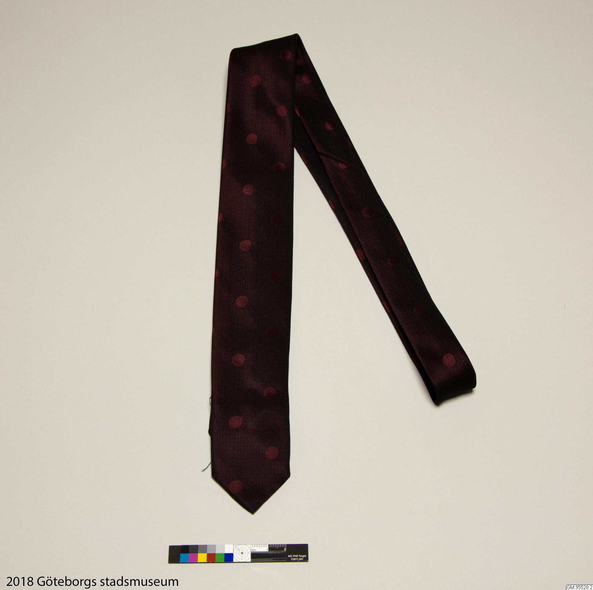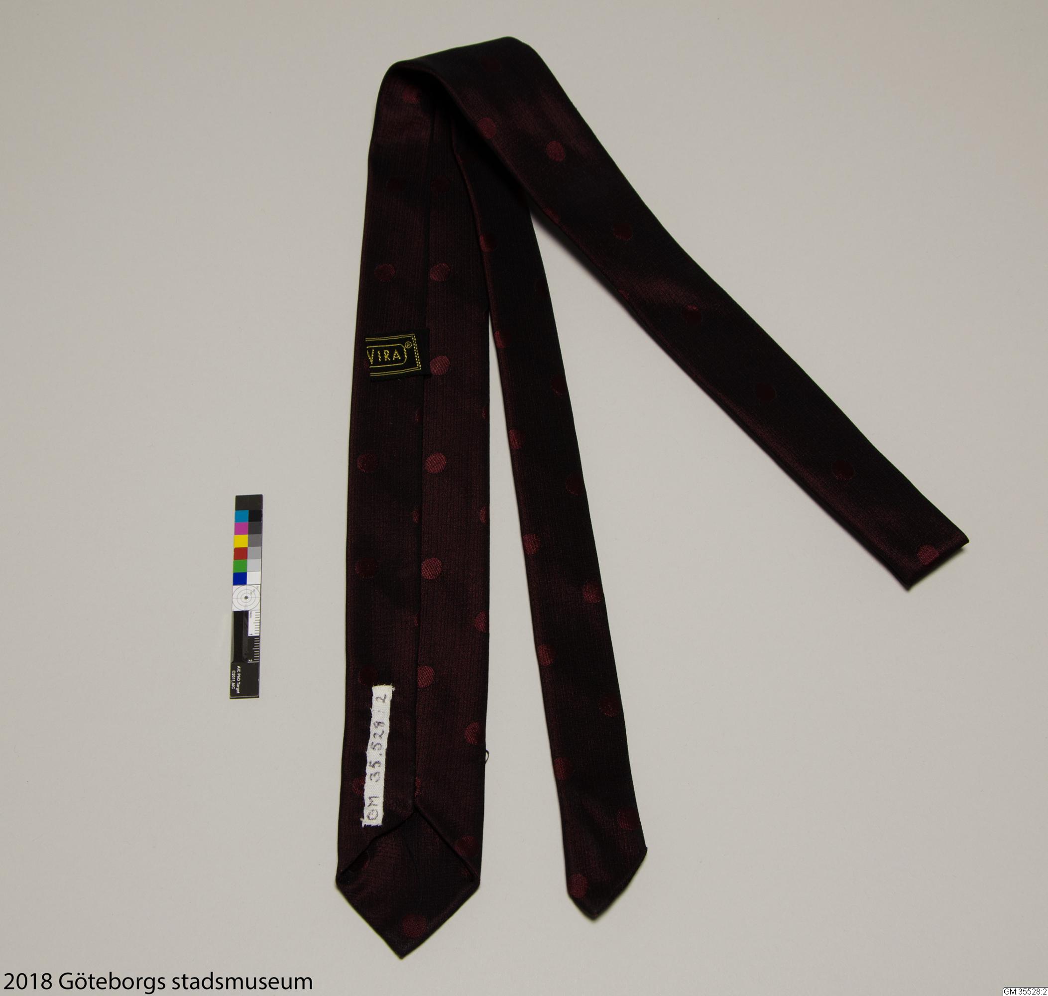 • "Rödviolett treviraslips med röda prickar. Smal, rak. Har tillhört giavren". (Wilgoth Eliasson) [från katalogkort]