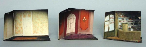 Tre scenbilder (måtten=strörta-minsta) Från vänster till höger: Rum med gulgröna mönstrade väggar, två dörrar, svart golv med orangefärgad matta. Rum med rosa paneler och orangeröda väggfält med lampetter, ett högt bågformat fönster med vinröda gardiner, lila golv. Rum med gröna väggar, på vänster sida glasrutor med påskrift BOKHANDEL, på höger sida hyllor med böcker och en dörr, framför dem en bå...