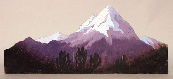 • Bergslandskap i lila nyanser med svarta silhuetter av kaktus i förgrunden.