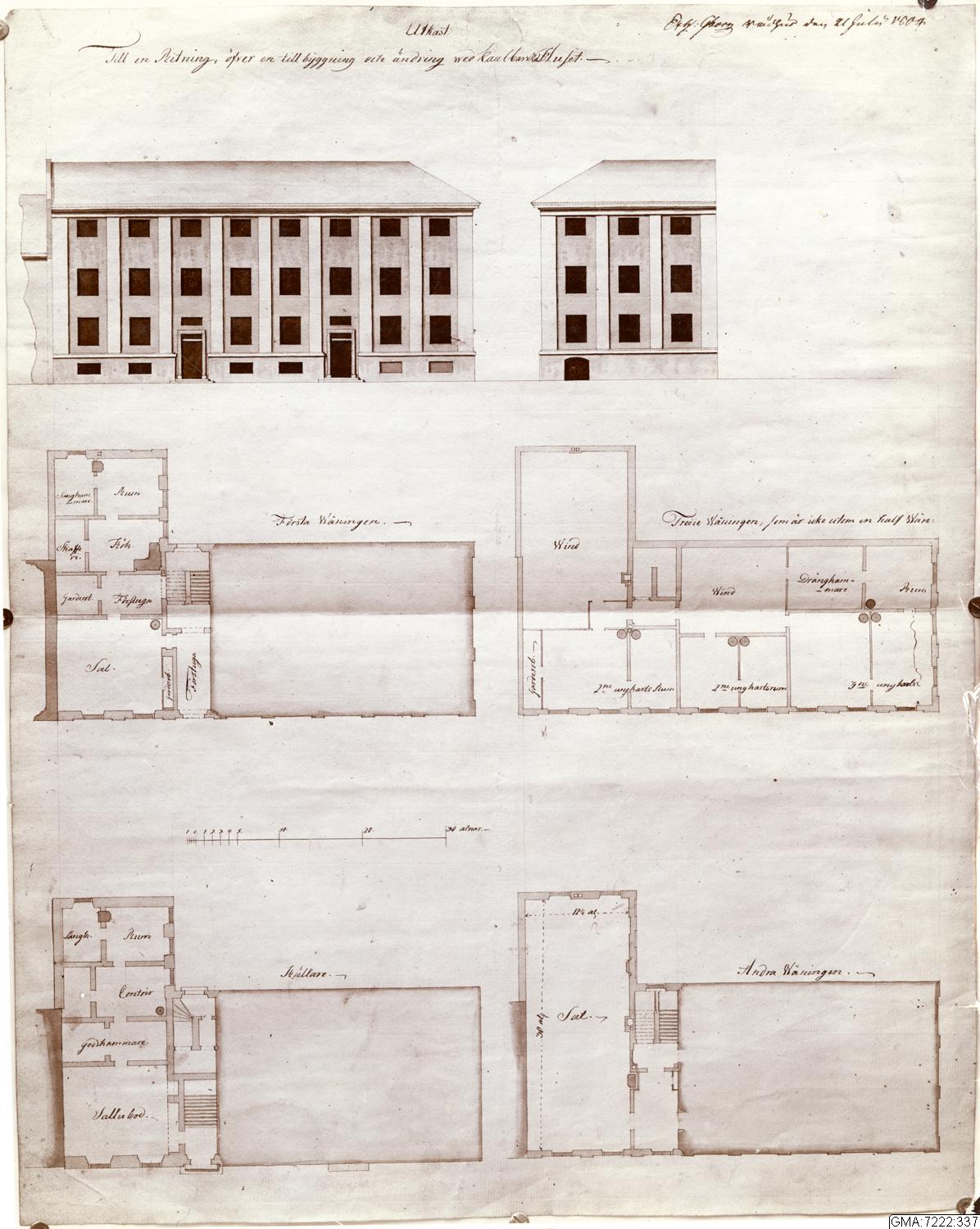 Kaulbarska huset, utkast för ombyggnation, aldrig utförd. Ritningen osignerad, men tillskriven Michael Bälkow. Exhib Göteborgs Rådhus den 21 juli 1804, d v s ritningen uppvisad på rådhuset nämnda datum.