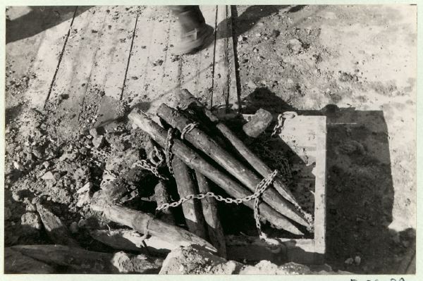 Grävningarna på Kommendantshusets tomt sedan detta rivits 1935. Rådhusgrävningarna 1935.Sektion i västra delen, detaljer. Pålar fr. rustbädd "C".