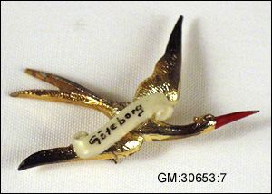 • brosch i form av trana, plast med metallfolie, spänne i metall