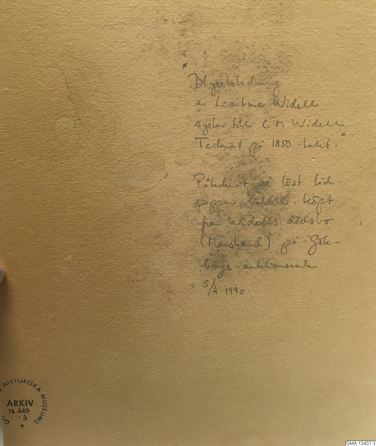 • Blyertsteckning av Leontine Widell syster till C.M Widell. Föreställer träd, tecknade på 1850-talet. På tecknat på löst täckpapper. Köpt från Widells dödsbo, (Marstrand) på Göteborgs autionsverk 5/4-1990.