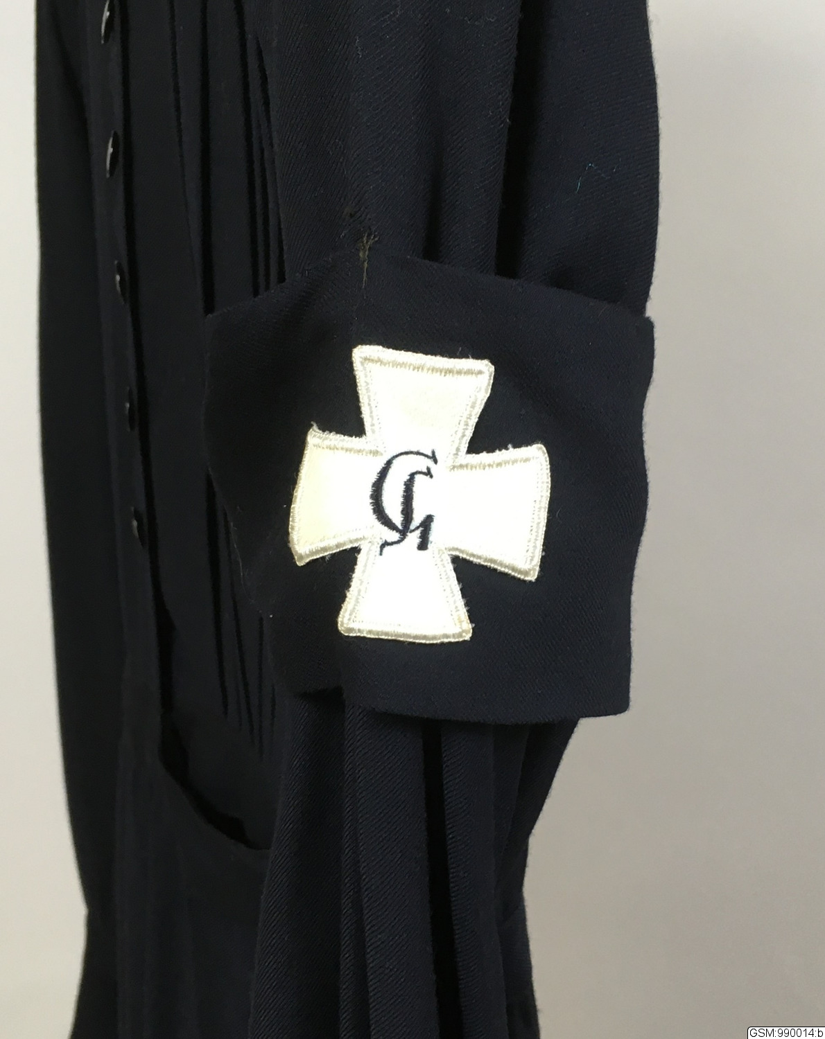 Korste klippt ur vit yllekypert. Ytterkanterna avslutade med en broderad kant i vitt och bokstäverna GS broderade med svart på korsmitten.