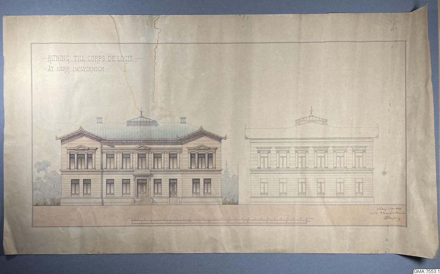 • Ritning till corps de logis åt herr J. W. Lyckholm. Göteborg i febr. 1889, å F. O. Petersons ritkontor. C. F. Ebeling. Fasader 2 st. varav 1 i tusch och akvarell, 1 i tusch.