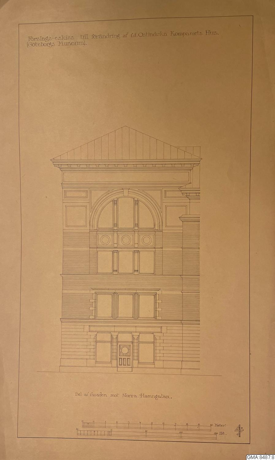 • Förslags-skiss till förändring af f.d. Ostindiska Kompaniets Hus. (Göteborgs Museum). Del af fasaden mot Norra Hamngatan.