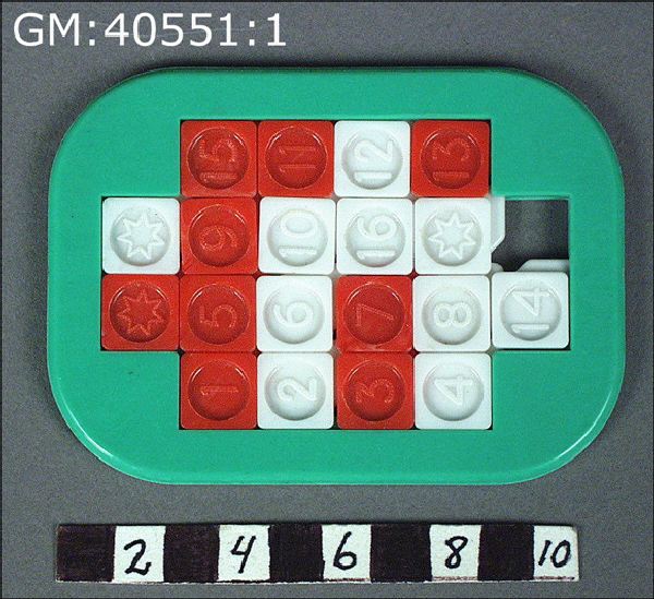 flyttbara brickor i vitt och rött med siffror 1-16 samt 3 st med stjärnor; brickorna är monterade i en ram av grön plast och kan bara förskjutas inbördes inom denna. Spelet går ut på att ordna sifforna i en i förväg bestämd ordning.