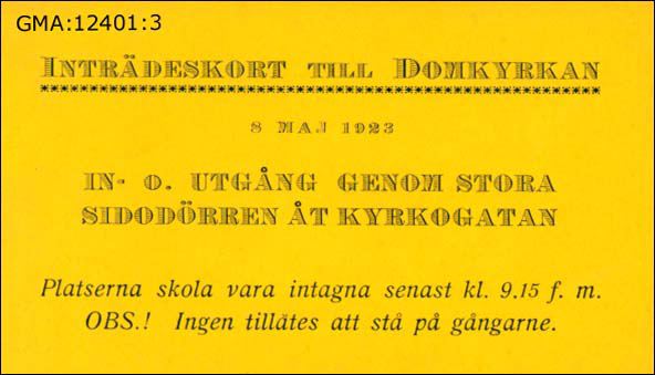 • Inträdeskort till Domkyrkan 8 maj 1923