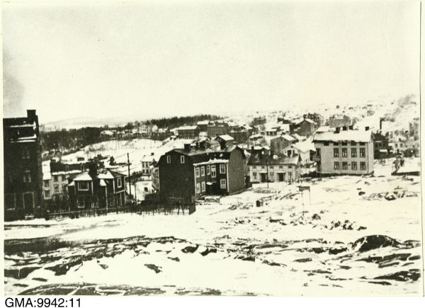• Parti av Lunden, utsikt norrut. T.h. (vitt hus) S:t Pauligatan 20. Två våningar + vindsvån.