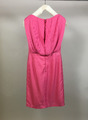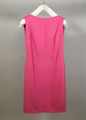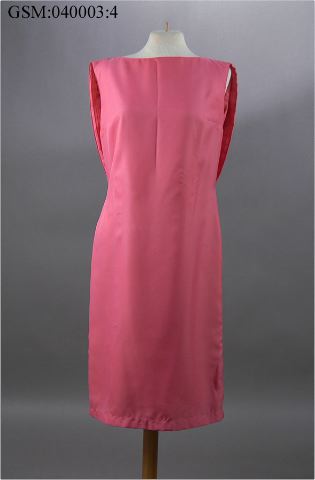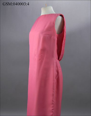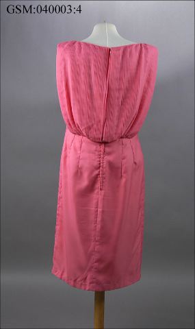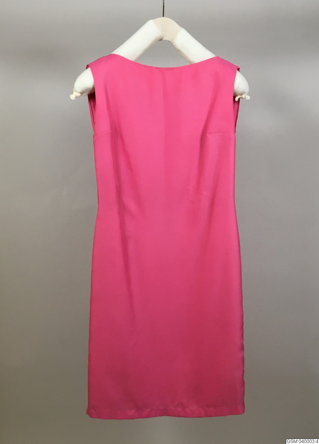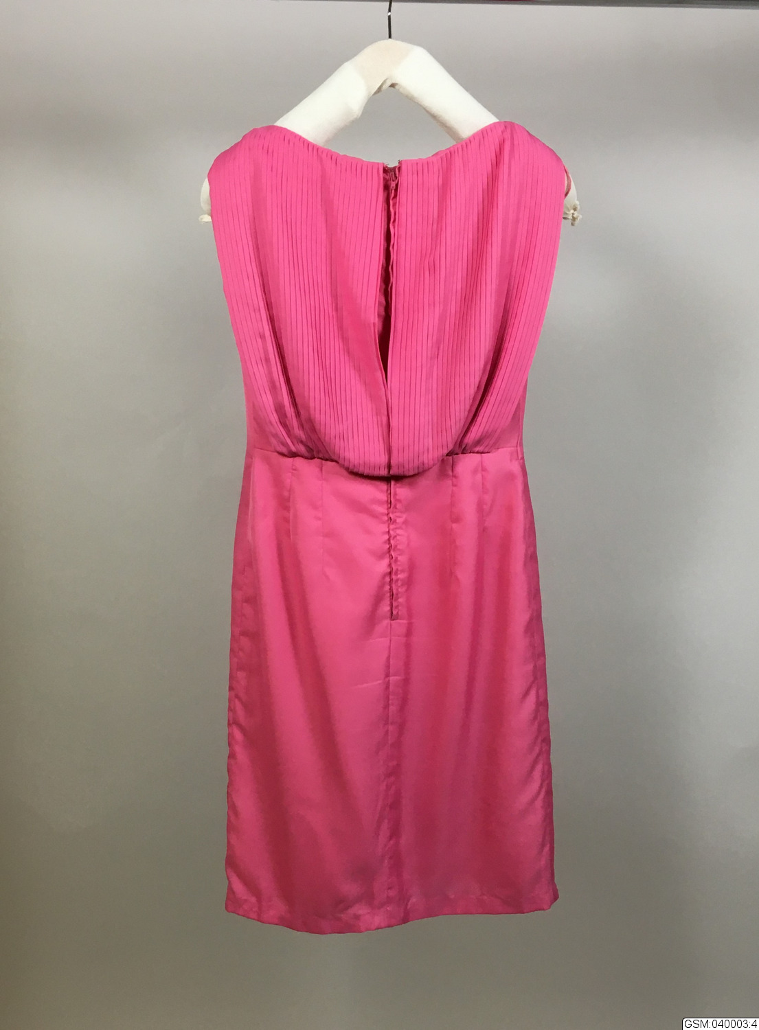• fodralklänning, ärmlös, rak modell med plisséveckad lodrät drapering på ryggsidan av livet. Intensivt rosa konstmaterial i skir crepekvalitet.