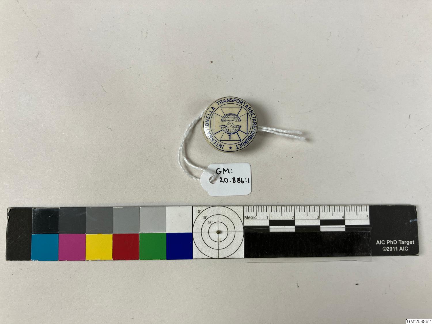 • rockmärke för Göteborgs Hamnarbetarfackförening. buren på kongressen1898, runt märke med vit botten mörkblå text och linjeteckning, stolpknapps konstruktion.