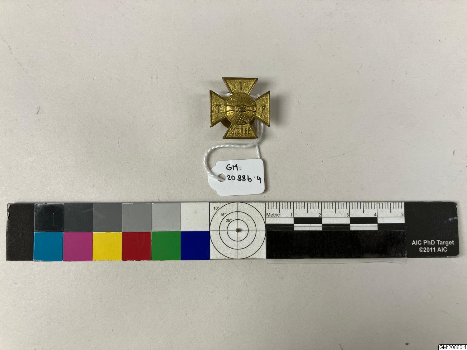 • Rockmärke för Göteborgs Hamnarbetarfackförening. Troligen buret antingen på kongressen 1904 eller 1907, Malteserkors-format märke av gulmetall, stolpknapps konstruktion.