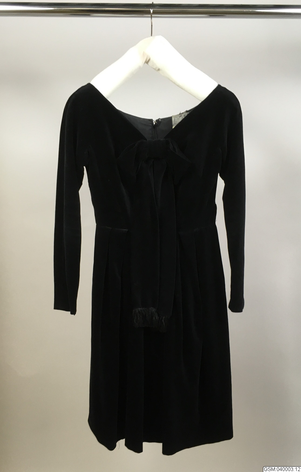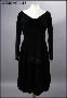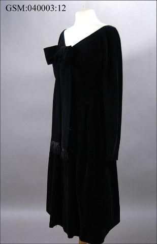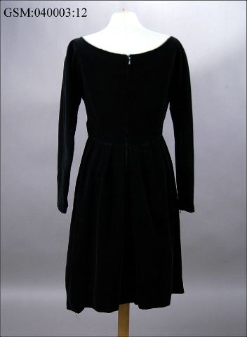 • långärmad klänning i tulpanmodell med sstyv underkjol, svart sammet, blixtlås vid ärmarnas handleder förutom mitt bak.
