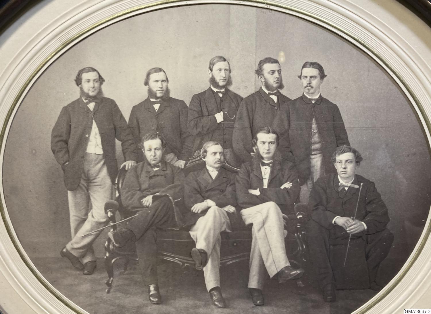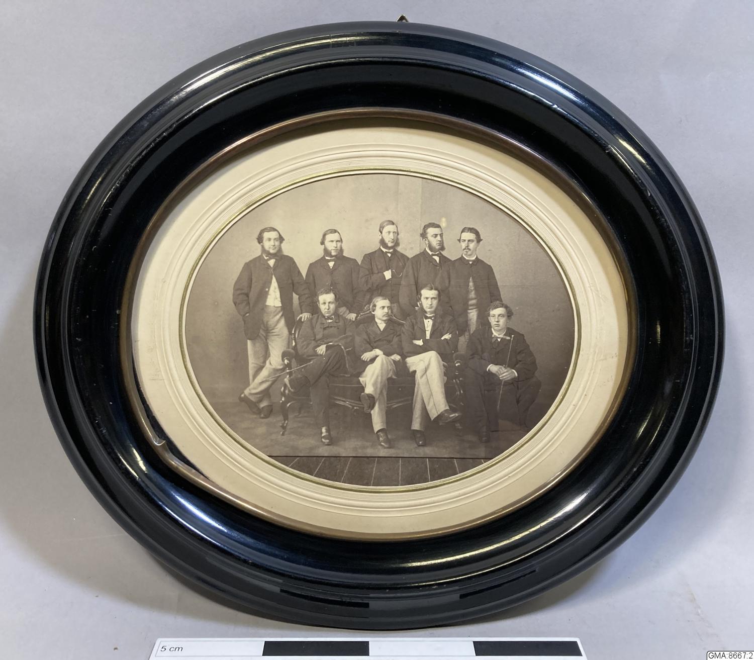 • 2. fotografi, ovalt, i svart profilerad ram, likaledes oval: gruppbild av yngre herrar, däribland August Fröding. Fotot taget av Atelier Unna & Höffert, Göteborg. 1860-talet?
