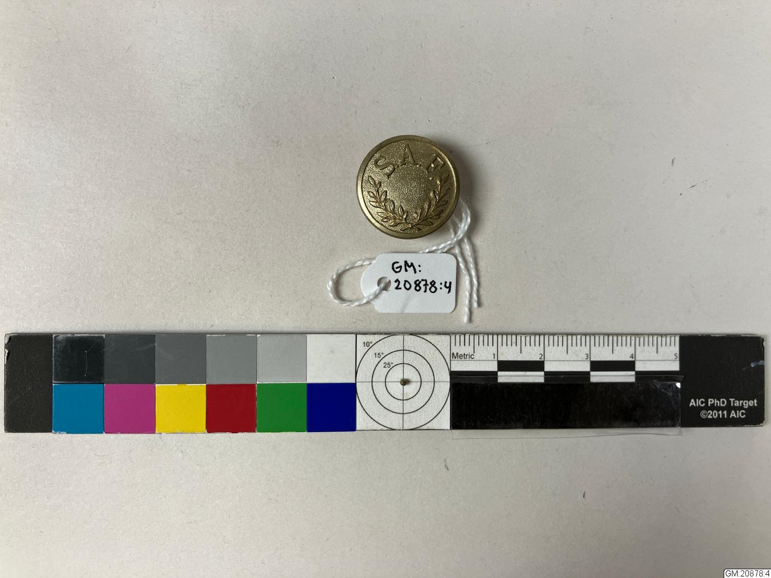 • Kvartalsmärke av stolpknapps-typ, av vitmetall, för S.A.F. (Göteborgs Stuveriarbetar Fackförening)