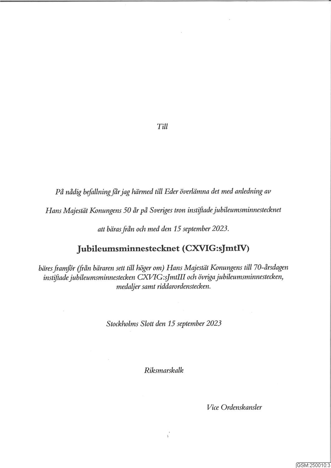 • medaljbrev, diplom, till Carl XVI Gustafs jubileumsminnestecken IV, 2023.
