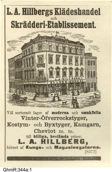 L.A. Hillbergs Klädeshandel och Skrädderi-Etablissement. Väl sorteradt lager af moderna och smakfulla Vinter-Öfverrockstyger, Kostym- och Byxtyger, Kamgarn, Cheviot m. m. till billiga, bestämda priser L.A. Hillberg, hörnet af Kungs- och Magasinsgatorna [8372]